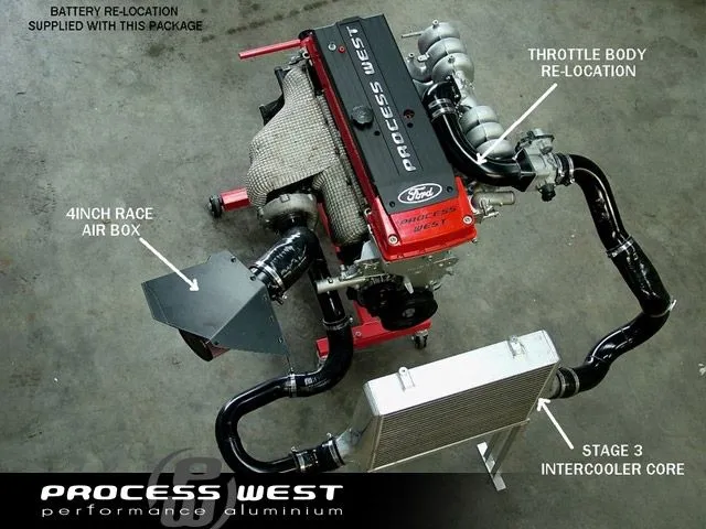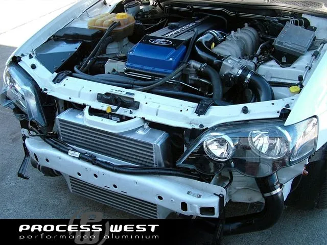 The Process West Stage 3 Front Mount Intercooler Core for the Ford BA/BF Falcon includes a 500 x 425 x 100mm bar & plate core, which is the largest and most efficient intercooler for the BA/BF Falcon on the market today. This allows for smooth flow and effective cooling of the charge air entering the engine. Includes hot and cold-side intercooler piping with lightweight mandrel bent aluminium piping.