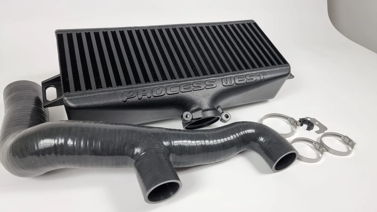 When pushing the car hard, the stock intercooler will heat soak quickly and take a long time to cool back down. This causes the performance of the motor to decline and power to suffer. The Process West intercooler is a direct factory replacement that features a larger than stock core and lower pressure drop. These 2 features previously stated allow the intercooler to flow more air while reducing the amount of pressure that is lost over the surface of the intercooler. These features allow the intercooler to work better for longer and also allow a larger amount of air to pass through the core. The combination of these things will allow this intercooler to handle upwards of 400WHP. This Process West TMIC includes everything needed to make it a direct factory replacement.