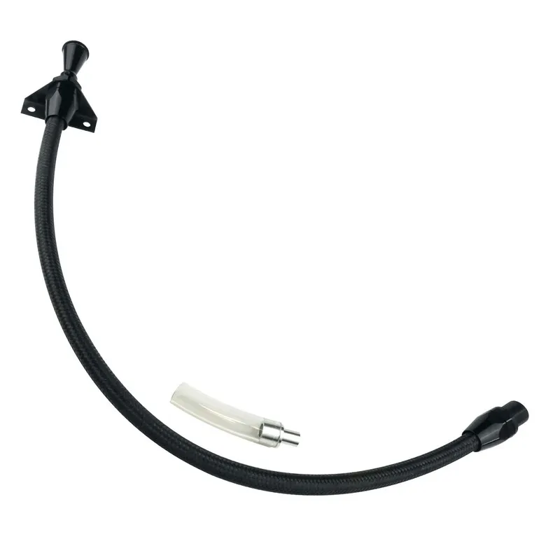 You get flexibility with our PTFE flexible stainless transmission dipstick. Kit comes complete with a braided stainless outer housing and a heat resistant, easy to read flexible inner dipstick cable. Inner cable is molded with appropriate trans fluid levels. Billet aluminium handle and billet aluminium fittings complement Proflow's flexible engine dipsticks.