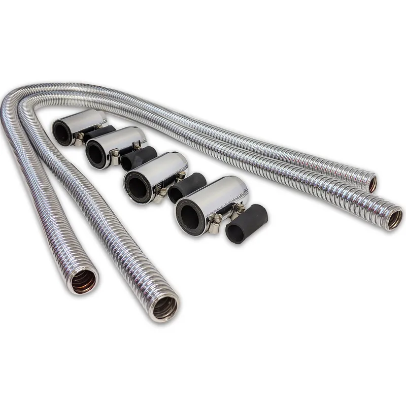 These universal stainless steel radiator or heater hose kits are designed to replace your standard rubber hoses. They feature stainless steel construction with a durable chrome or black plating and can be cut to length. The supplied hose end covers and adapters make them perfect for any vehicle.