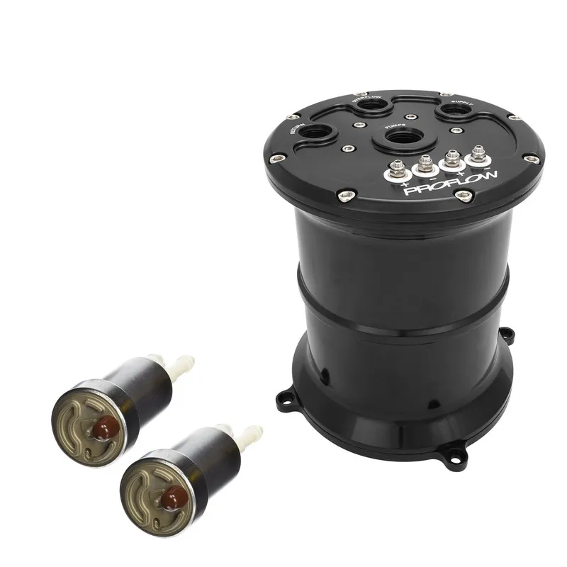 Proflow's triple fuel pump surge tank prevents engine fuel starvation due to sloshing or inadequate tank baffling while the vehicle experiences high lateral inertial forces on the track or strip due to acceleration and cornering. This compact 3-piece billet surge tank system maintains a small amount of fuel to operate its own internal fuel pump(s) that can supply high fuel flow rates, while only needing a relatively low fuel flow rate from the main fuel pump.