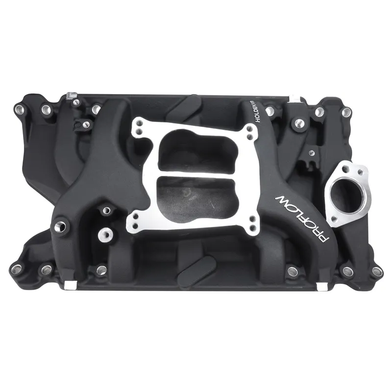 Proflow's AirDual intake manifold is designed for street 253-304-308 c.i.d. Holden Commodore V8 engines. This intake manifold is a dual-plane design that is tuned for excellent throttle response from idle to 5500 RPM, aiding in fuel vaporisation and increasing volumetric effiiciency. Designed to fit both early and late cylinder head bolt hole patterns, pilot holes have been drilled on each side of the exhaust crossover. Accepts both square-bore and spread-bore carbs. Fits Red/Blue/Black engines. Does not have a provision for external heat crossover. These are available in natural or black powdercoated cast-aluminium finishes.