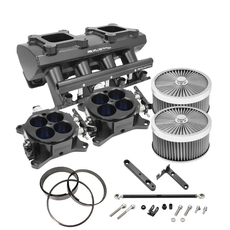 Proflow's SuperMax fabricated intake manifolds are cost effective and performance filled! These black powdercoated intake manifolds feature 3mm (1/8") thick 6061-T6 sheet aluminum construction with 100% TIG welds for strength and durability. The tapered intake runners are designed to increase air velocity to evenly distribute airflow to all 8 cylinders, improving throttle response and providing consistent volumetric efficiency for your engine. There is also provision for a standard GM LS map sensor to be mounted on the rear of the plenum.