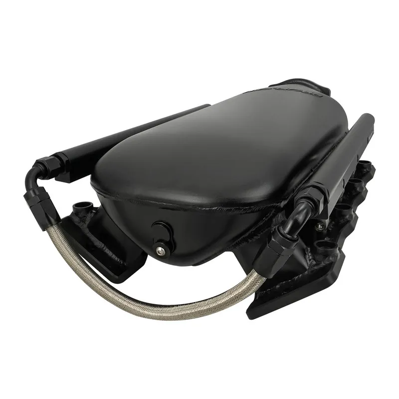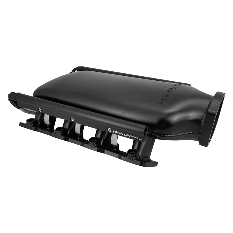 Proflow's SuperMax Plus fabricated intake manifolds are cost effective and performance filled! These black powdercoated intake manifolds feature 3mm (1/8") thick 6061-T6 sheet aluminum construction with 100% TIG welds for strength and durability. The tapered intake runners are designed to increase air velocity to evenly distribute airflow to all 8 cylinders, improving throttle response and providing consistent volumetric efficiency for your engine. There is also provision for a standard GM LS map sensor to be mounted on the rear of the plenum.
