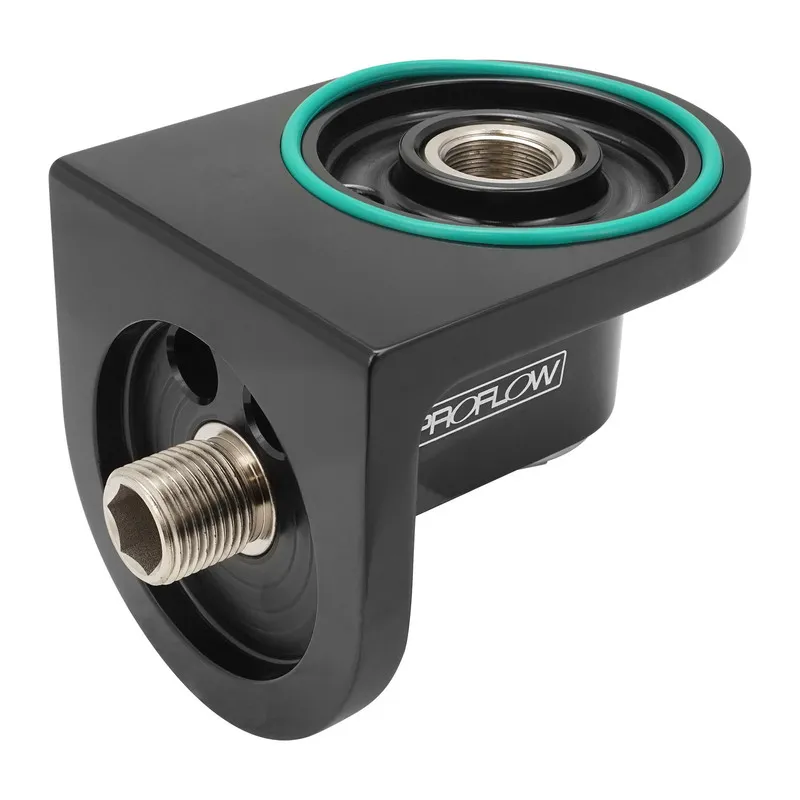Originally designed by Ford Motorsport as a cast aluminium piece This Billet oil filter head adaptor allows you to rotate your oil filter 90 degrees to gain more clearance from your header pipes and other engine bay accessories. This also makes for easier servicing. It utilizes a banjo bolt design which is sealed with a FKM o-ring. It has a 3/4”-16 thread and suits all traditional Ford V8 engines that accept a FRAM HP1 filter,  or any short body filter, such as a Ryco Z10, Z89A or the smallest option being Z418 which is not only a short 85mm in length but also much smaller diameter