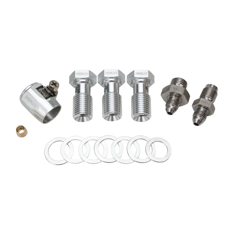 Note: This kit suits aftermarket turbochargers only as the RB25 factory turbo has an M18 x 1.50mm banjo bolt. RB20 engines have an M16 x 1.5mm banjo bolt. Additional fittings (PFE715-06 / PFE721-06) may be required.