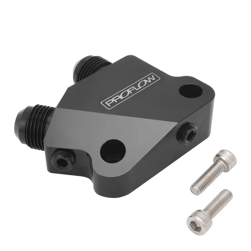 Proflow's Billet oil cooler adapters replace the OEM oil filter housing. These oil filter bypass adapters allow for the installation of a remote oil filter and optional oil cooler. Their billet construction is black anodized and stainless hardware is included. They use O-ring seals for a leak-free installation.