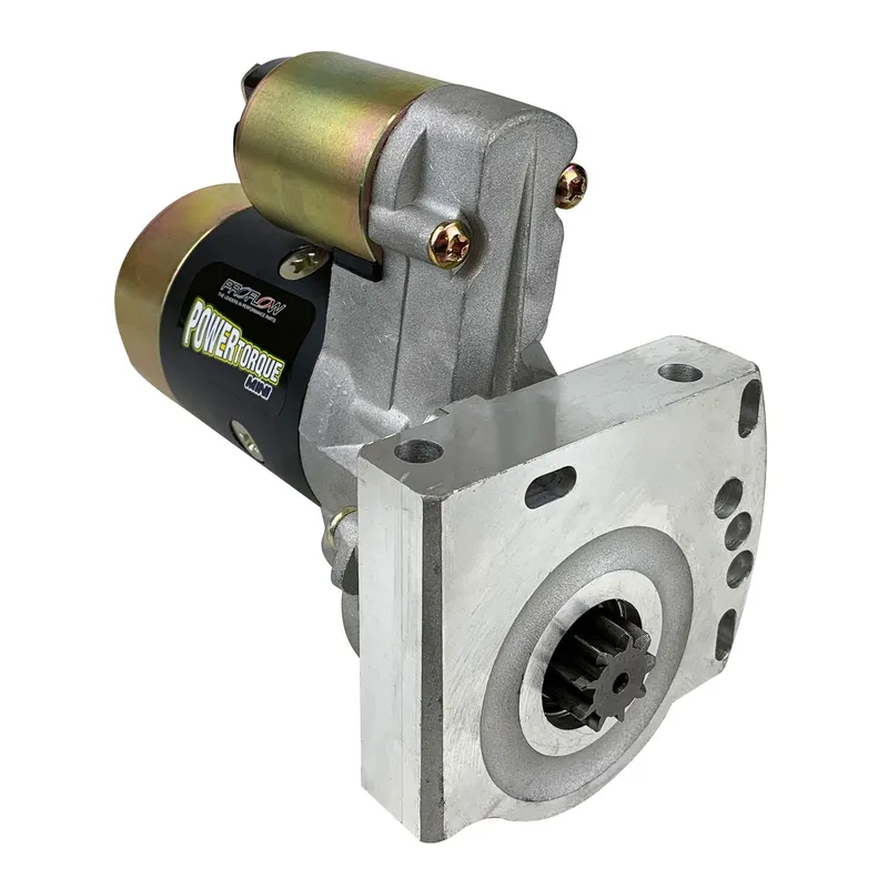 Proflow's Powertorque Mini starters provide extra powerful motors that crank out up to 200 ft-lbs (270 Nm) of torque. Coupled with their 4.4:1 gear reduction ratio, they provide enough torque to start engines with a whopping 18:1 compression ratio! These starters come with a multi-hole clockable billet adaptor/mounting block for durability and are compact enough to clear most modified oil pans.