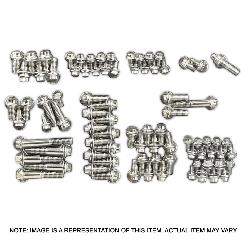 These 12pt stainless bolt Kits are grouped together and labelled for size and length plus the specific application is given. These Kits include intake, manifold, oil pan, alternator, water pump, distributor, timing cover, fuel pump & valve covers. The SB Ford engine Kit, may contain some bolts not needed and may not include every bolt required on some engines.