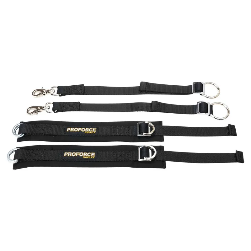 Proforce Safety arm restraints are covered in flame-retardant foam and flame retardant cloth - not like cheaper nylon covered arm restraints used by other manufacturers. The cuffs and straps are made from high-strength nylon. For ease of use, we use individual straps with quick release clips.