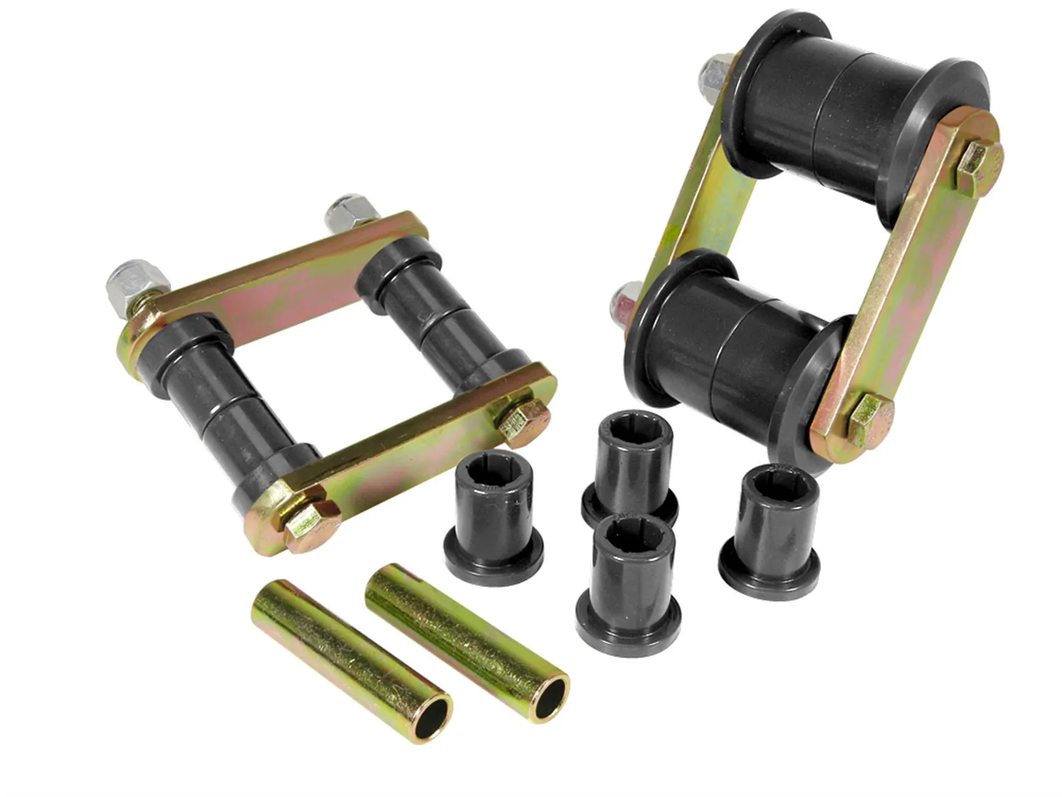 In leaf spring-type suspensions there are significant forces focused on the pivot points and shackles. For this reason, it is imperative to replace the soft, blown-out OEM rubber bushings with Prothane premium grade polyurethane components. All related sleeves, etc.. are precision fabricated to assure a perfect fit.
