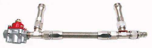 Silver braided fuel line and bypass regulator (designed for electric fuel pumps). Fits SS-Series® and Holley® carburetors with 7/8"-20 fuel bowl threads. #8AN inlet.