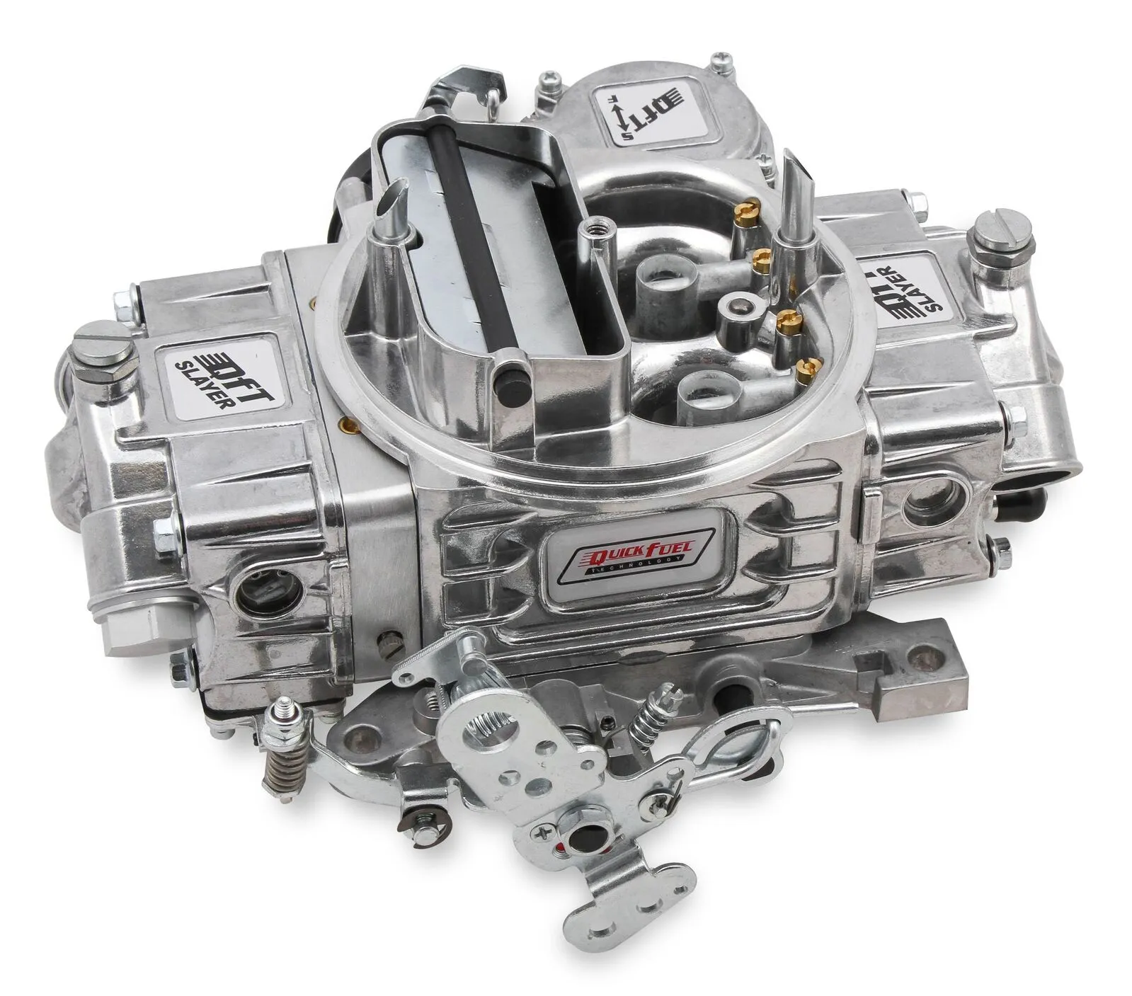 Slayer Series street carburetors are designed with many of the same innovations and features that are built into all QFT™ race-winning carburetors, including changeable air bleeds and power valve channel restrictions. It's designed with a secondary metering plate with changeable jets, and features all aluminum components for additional weight savings. All Slayer Series carburetors are equipped with universal throttle levers to accommodate Ford A/T kickdown, GM 700 R4 mounting holes, and ability to mount brackets for Chrysler vehicles. Slayer Series are available in 450, 600, and 750 cfm vacuum secondary models.