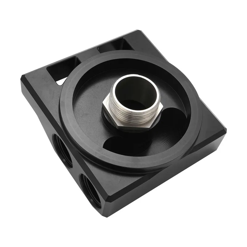 These remote 4-port oil filter heads allow you to relocate your oil filer for easy access and quicker servicing. Featuring an integrated mounting bracket and supplied with fasteners, it features either a 13/16” or 1-1/2” thread and are designed to be used with many large oil filters from a variety of brands including FRAM (HP6). Black anodised AL6061-T6 construction with 4x AN12 ORB ports, allowing for large oil flow rates. Mounting threads are 3/8”-16.