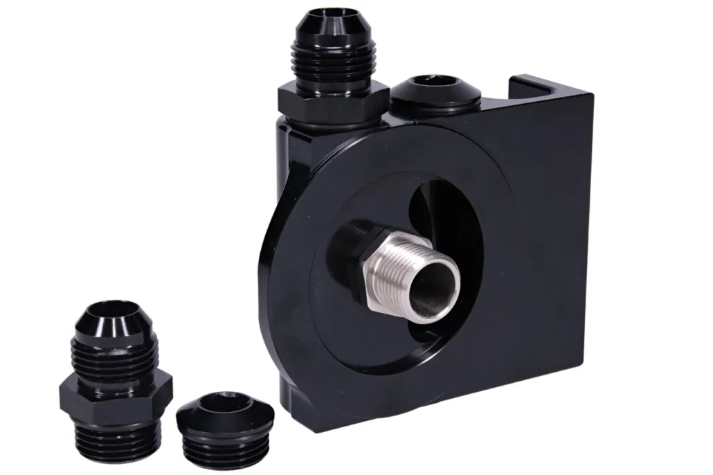 Raceworks Billet 4 Port Side Entry Remote Oil Filter Mount. Suitable for oil filter relocations. Suits Z9 filter or ALY-115-34BK.