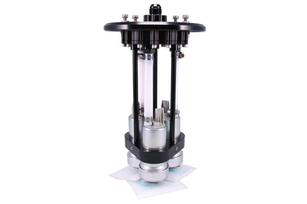 Anodized black, this triple fuel pump hanger can be fitted with one, two or three pumps, and has triple stainless electrical terminals allowing the pumps to be staged separately. E85 ready with teflon seals and intank hose and viton o-rings.