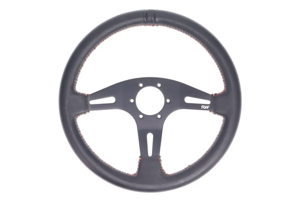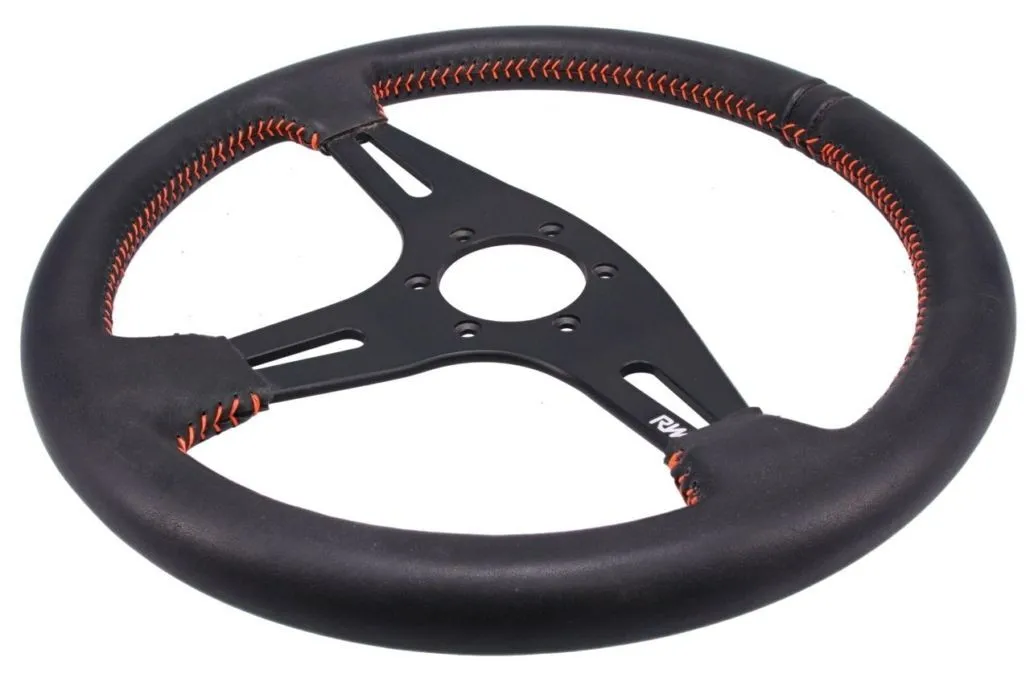Raceworks Leather Steering Wheel – Black|Orange Stitching. 350mm 6x70mm bolt pattern.