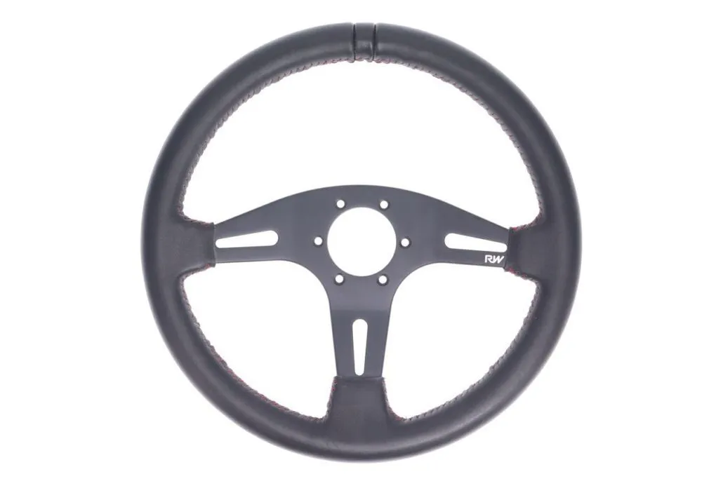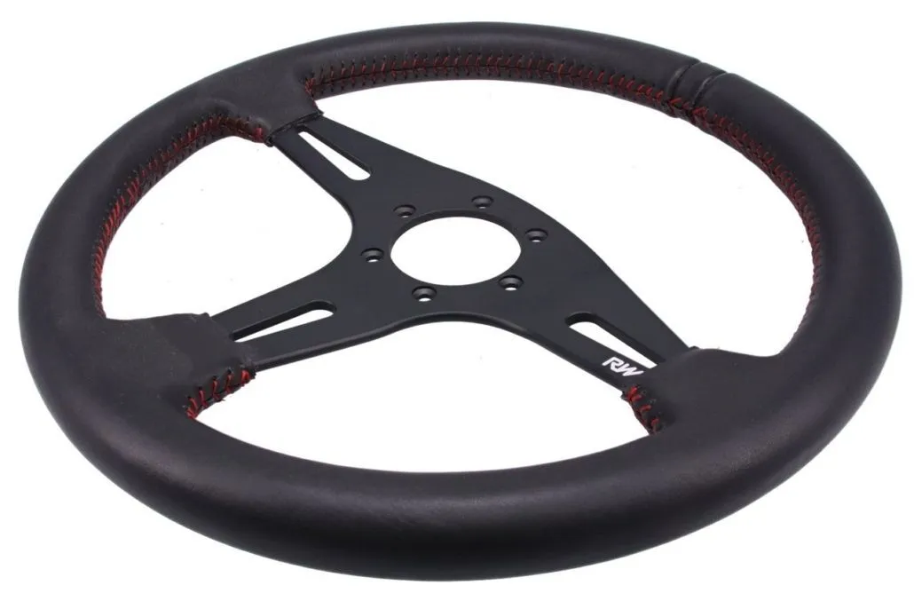 Raceworks Leather Steering Wheel – Black|Red Stitching. 350mm 6x70mm bolt pattern.