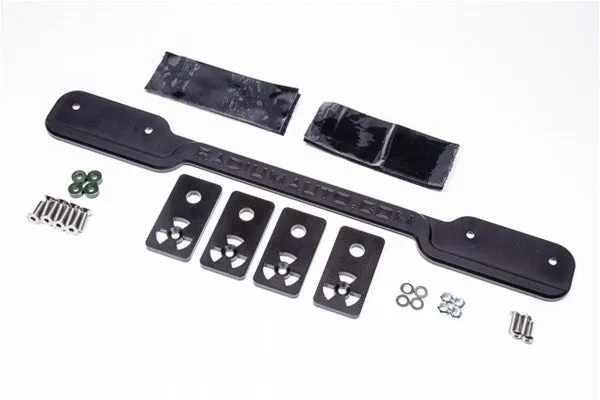 Part of the modification process is to separate the deck lid hinge mounting points from the firewall. The included hinge brace adds structure back into the hinge support member after the modification is made. The factory steel body shims are taped on to the rear subframe and upper rollbar mount. The aluminum Radium shims bolt in place for a more permanent solution using stainless steel countersink hardware.