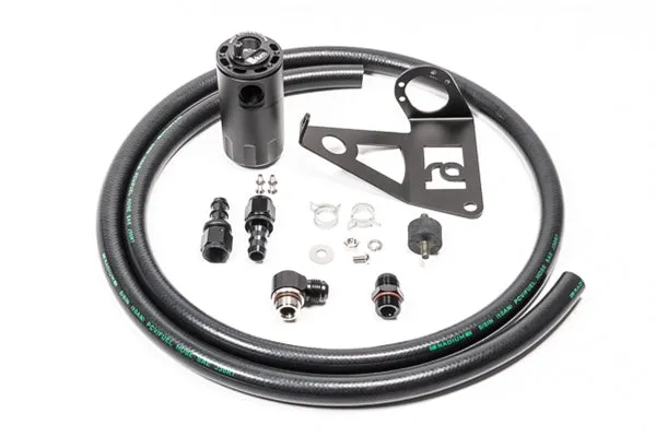 The catch can draws out oil and water condensation from the crankcase gasses that would otherwise be drawn into the intake manifold. This prevents oil buildup in the intake, intercooler system walls, throttle body, and intake manifold. This effectively raises the octane, can increase engine performance from cleaner inlet air, and can lower hydrocarbon emissions. The closed system prevents unwanted oil vapors from entering into the cabin. Catch can kits include everything needed for a complete installation.