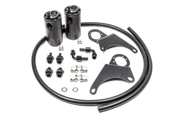An oil catch can is essential on a performance vehicle to protect the engine from elevated levels of crankcase blow-by accumulated from aggressive driving. Excess oil-saturated air circulating back into the air intake stream can lead to degraded performance.