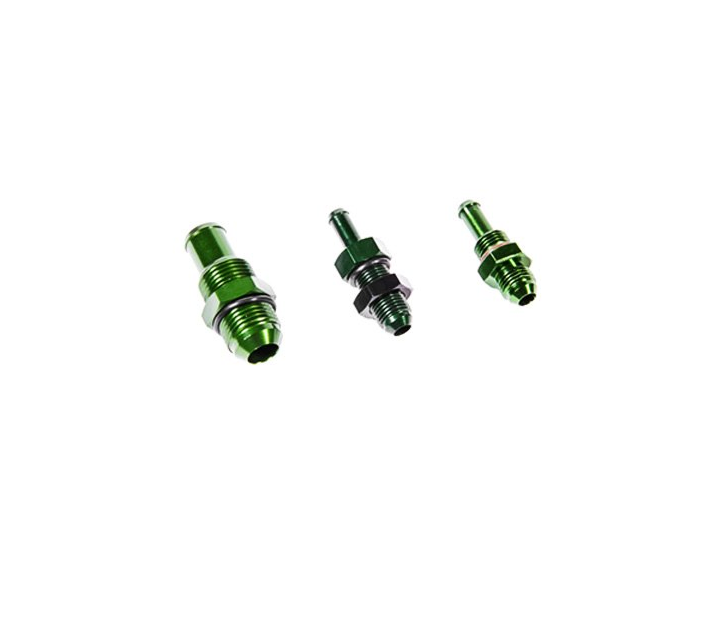 Universal 5/16" Barb to 6AN Fuel Tank Bulkhead Fitting (20-0170) by Radium®. Bright-dipped green anodized aluminum bulkhead fittings.