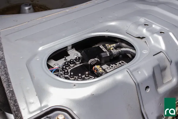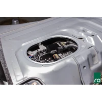 Unlike the 2004-2007 WRX STi OEM variation, the Radium Engineering collector box has been optimized to work in ALL gas tanks. Shown below is the smallest OEM gas tank baffle found in the model list above. It improves the fuel supply around the pump(s) inlet. There is a 1" check valve incorporated on the front side of the tank that serves as a trap door keeping the pump(s) supplied with fuel during aggressive driving. Furthermore, all returning fuel from the pressure regulator return and the crossover hose enter the collector box keeping it full. The OEM fuel level and fuel temperature sensors secure to the mounting bracket.