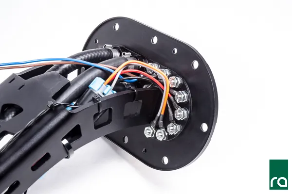 The custom designed stainless electrical studs easily handle the high current demand that compact bulkhead connectors lack. These serviceable connections are properly sealed and impervious to all standard and exotic fuels. The low profile design keeps all wiring tucked nicely underneath the OEM cover plate. Nonconductive acorn nuts are provided to prevent any accidental short circuits.