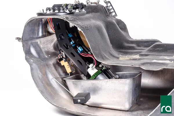 The machined assembly mounts in the factory fuel tank using the OEM gasket and hardware. The fuel level sender and temperature sensors are retained, as shown below.