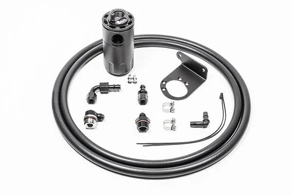 The catch can draws out oil and water condensation from the crankcase gasses that would otherwise be drawn into the intake manifold. This prevents oil buildup in the intake, intercooler system walls, throttle body, and intake manifold. This effectively raises the octane, can increase engine performance from cleaner inlet air, and can lower hydrocarbon emissions. The closed system prevents unwanted oil vapors from entering into the cabin. Catch can kits include everything needed for a complete installation.