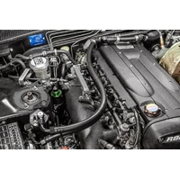 This Radium Engineering dual catch can kit is designed specifically for the RB26DETT. Careful measure and considerations were put forth to make this a proper system. It retains a true PCV system and includes catch cans for both the PCV valve side and and crankcase vent (CCV) side of the ventilation system. The catch cans do NOT vent to atmosphere (VTA), thus are emissions and track legal. Closed loop systems remove the oil and sludge from the PCV gasses before it is routed to the engine to be burned. A closed loop system also promotes negative crankcase pressure for optimal performance. Furthermore, closed systems prevent unwanted oil vapors from entering the cabin.