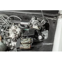 The PCV catch can mounts to threaded bosses on the front RH strut tower. It runs inline between the crankcase vents found on the valve cover and the PCV valve on the vacuum chamber. Large 5/8" hose and 10AN fittings are provided for both ends of the catch can.