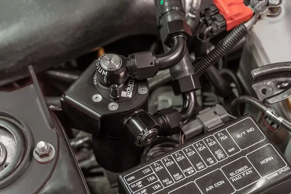 Each catch can features large 10AN ORB ports, a 4AN ORB drain port, 2-step oil separation baffling, and an O-ring sealed dipstick. They mount using factory holes and integrate perfectly with the surrounding components. The dipsticks built into the catch cans allow easy inspection of accumulated fluid. No extra inline check valve is required since Radium catch cans are pressure sealed. No cutting, drilling or permanent modifications are required.