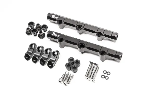 Manufactured with a large internal bore, the fuel rails can support all necessary engine power requirements. They are CNC machined from solid 6061 aluminum, black anodized, and laser etched for a high quality surface finish.
