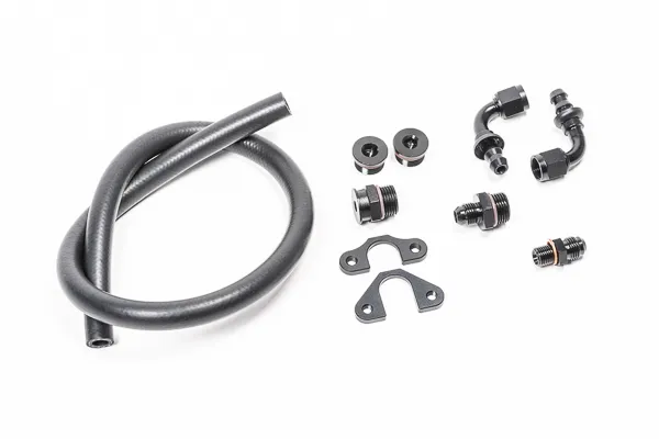 The plumbing kit includes the items shown in the image above and allows easy hookup of the 20-0870 Radium Fuel Rail to the factory feed line. It is intended to be used with the factory pressure regulator, but can also work with an aftermarket regulator.