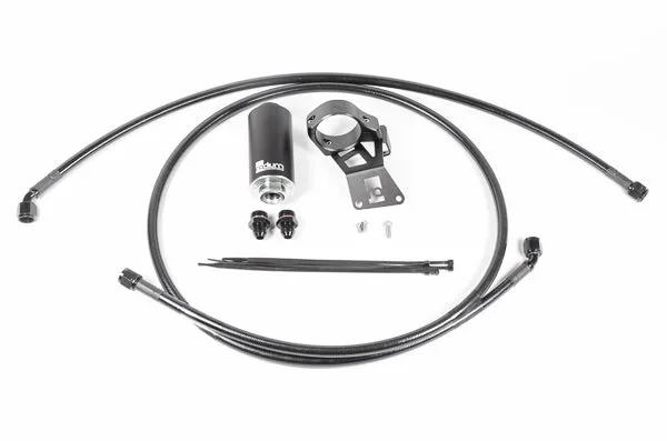 From the fuel pump hanger, the feed line kit passes fuel through a Radium in-line fuel filter using prefabricated 8AN PTFE hoses. The filter is mounted to the chassis under the car using a specially designed bracket that does not require any cutting or drilling for installation. A selection of fuel filter elements are available.