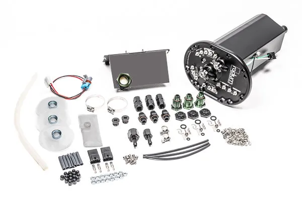The Radium Engineering fuel surge tank hanger can be used with up to three aftermarket high pressure pumps and 1 lift pump in the stock Mazda FD RX7 fuel tank. The unique integrated 1.85L surge tank completely eliminates fuel starvation. No grinding, bending, or modification of the trunk floor sheet metal is required.