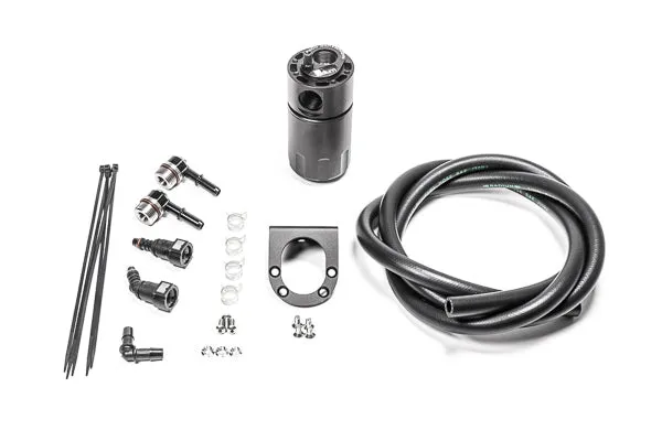 The catch can draws out oil and water condensation from the crankcase gasses that would otherwise be drawn into the intake manifold. This prevents oil buildup in the intake, intercooler system walls, throttle body, and intake manifold. This effectively raises the octane, can increase engine performance from cleaner inlet air, and can lower hydrocarbon emissions. The closed system prevents unwanted oil vapors from entering into the cabin. Catch can kits include everything needed for a complete installation.