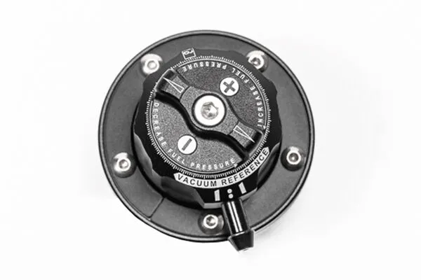BUILT-IN REGULATOR RA-series regulators feature the first tool-less pressure adjustment. A jam nut and set screw are no longer required. With a simple turn of the knob, pressure will be increased or decreased. Additionally, there are no inherent air (vacuum/boost) leaks through the threads that traditionally a smoke detector would pick up. To aid in adjusting pressure, there are incremental detents that provide haptic feedback to the user. Every detent permits 1psi (+/-0.5psi) of adjustment depending on current fuel pressure. Furthermore, RA-series regulators feature a 360 degree swiveling vacuum reference port that is double O-ring sealed. This is the first in the industry. It permits the installer to quickly point the vacuum fitting in any direction with no tools required.
