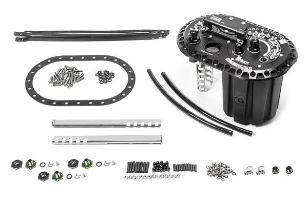 A fuel cell is NOT included with the FCST-X. The fuel cell MUST use a 6x10, 24-bolt fill plate flange. The distance from the outer top face to the internal floor must be at least 7.7" (196mm). The distance from the top of the fuel cell to the bottom of the lift pump filter (lowest point of the kit) is adjustable. However, if the fuel cell is deeper than 12.7" (323mm).