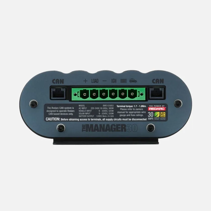 Whether youre charging Lead Acid, Gel, Calcium, AGM or Lithium Iron Phosphate batteries, The Manager30 represents a complete DC to DC charging and maintenance solution. If youre charging one auxiliary battery or more, The Manager30 will ensure theyre always fully charged, providing peace of mind when battery charge provides the power source for the comforts of home whilst travelling around Australia.