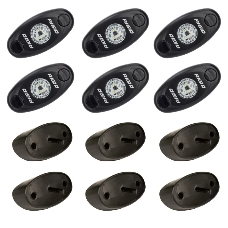 The RIGID Rock Light Kit uses the power and durability of A-Series LED lighting and adds custom 15 foot leads on each light, switch and angled mounts to light up the undercarriage of any truck, Jeep, or all-terrain vehicle. This kit will allow you to light up the trail with strategically placed lights on the vehicle. Perfect for night rock crawling, the LED lights are available in a variety of colors, including white, red, blue, or amber to aid night vision or accent vehicle colors. RIGID Rock Light Kits are available in 4-light or 6-light configurations to enhance and customize your night crawling experience. Own The Night with the original LED Rock Light Kit.