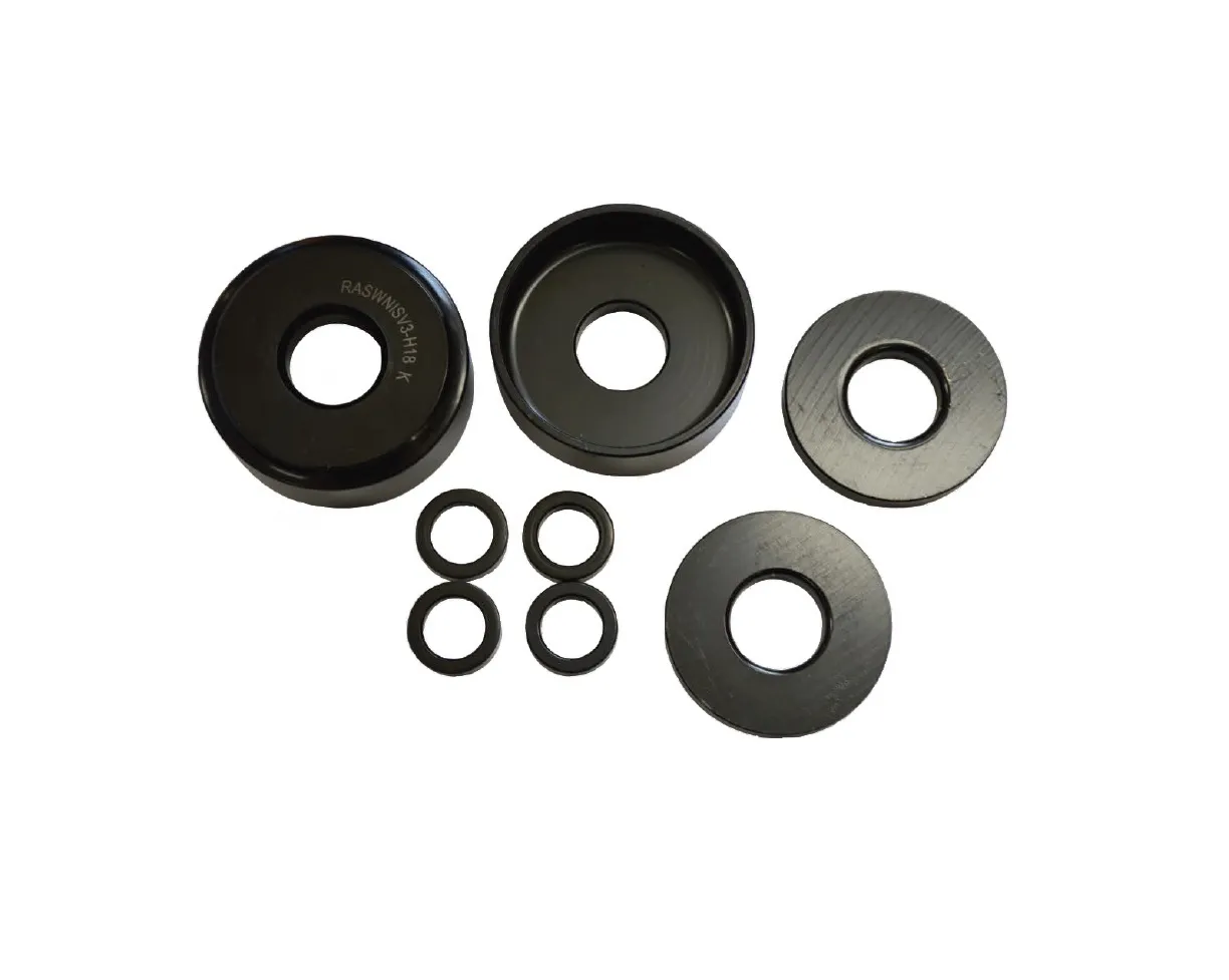 This new 2 piece design features all the key features and benefits of preceding versions with the added benefit of offering both a 7.5mm and 15mm spacing option in the one kit.  Utilising just kit1 allows for the maximum amount of spacing (7.5mm) before clearance issues arise on late model GU chassis's where the radius arm comes into contact with the panhard rod mount when using the larger spherical bush at almost full compression.  Earlier GQ's and GU Coil cab models can use both Kit1 and Kit2 spacers combined offering maximum forward movement of the front diff (15mm).