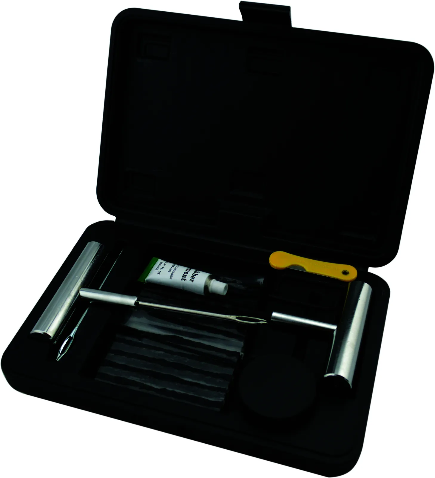 The Roadsafe Tyre Repair Kits allow for quick & easy emergency puncture repair, without the need of tyre removal. Easy to use, the robust Roadsafe kit is supplied with Heavy Duty metal style ‘T’ handle Reaming & Eyelet String Insertion Tools. Complete in a Hard Carry Case, the kit also includes lubricant, 30 repair cords (100mm), tyre glue, knife and replacement reamer & insertion tools
