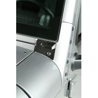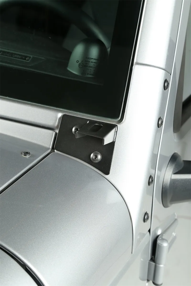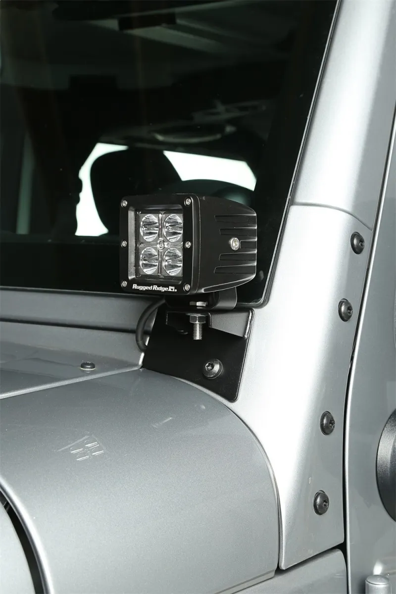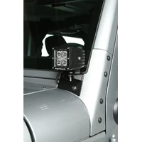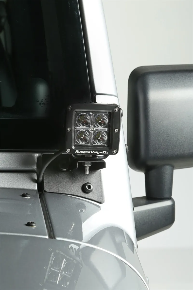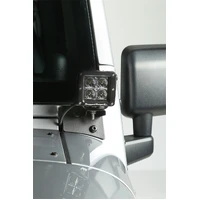 This pair of black powder coated windshield auxiliary light mounting brackets from Rugged Ridge bolts to the windshield hinges of your Wrangler. Each bracket allows for easy mounting of auxiliary lighting and is custom designed for an exact fit. Sold in pairs. Lights not included. No drilling required.