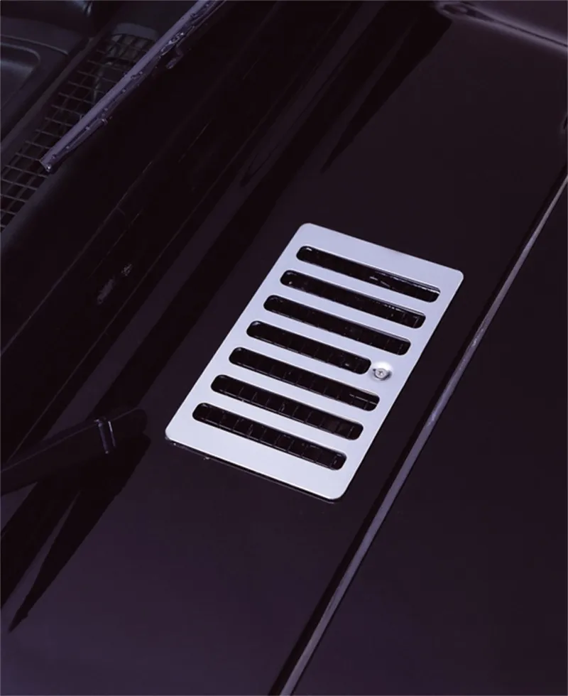 This weather resistant cowl vent cover was constructed of prime 304 stainless steel that has been polished to a mirror finish. 304 stainless steel is virtually rust proof guaranteeing that these parts will stand the test of time. All hardware is also constructed of stainless steel so the polished look you are going for is complete. Installs directly covering factory hinge using existing hardware. Sold individually.