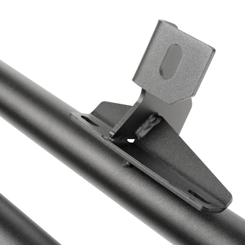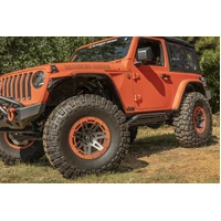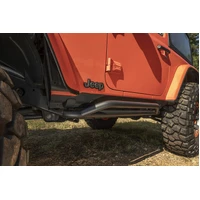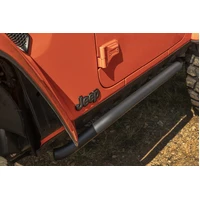 Get real-world protection in a classic rock crawling-inspired design with Rugged Ridge RRC Rocker Guards for Wrangler JL. Each guard is built from high-strength 2-inch OD steel tubing and designed to mount directly to the rear factory body mounts for a solid, bounce-free installation, while an angled upper hoop provides extra protection for those vulnerable rocker panels. Each RRC Rocker Guard is finished with a tough satin black powder coat that looks great while delivering superior resistance to rust/corrosion. Installation is a breeze with no drilling required. Comes in pairs.