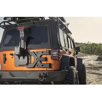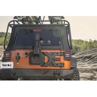 The Spartacus HD Tire Carrier System provides the ultimate in strength and stability for mounting your oversized wheel and tire. Functionally designed to manage the amplified force and vibrations produced during extreme off-road conditions. The precision die-cast aluminum Hinge Casting provides maximum strength without the excess weight of steel. The one-piece design maintains one-handed access to cargo area and rigidly links the Wheel Mount to the reinforced section of the rear quarter panel. This, in combination with forged steel hinge brackets and hardened steel pins, results in far superior load capacity than the factory tailgate hinges, thereby effectively reducing wear and increasing longevity. The Wheel Mount lifts the mounting position and incorporates depth and tilt adjustability for large diameter and wide tire options. Tested to MIL-STD-810 to simulate extended duration of vigorous off-road driving conditions. Rated for up to and including 37" wheel tire combinations. Includes adjustable third brake light bracket. Compatible with OE and most aftermarket rear bumpers. No drilling required. Patent Pending. Patent No. D758,829