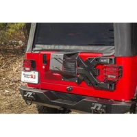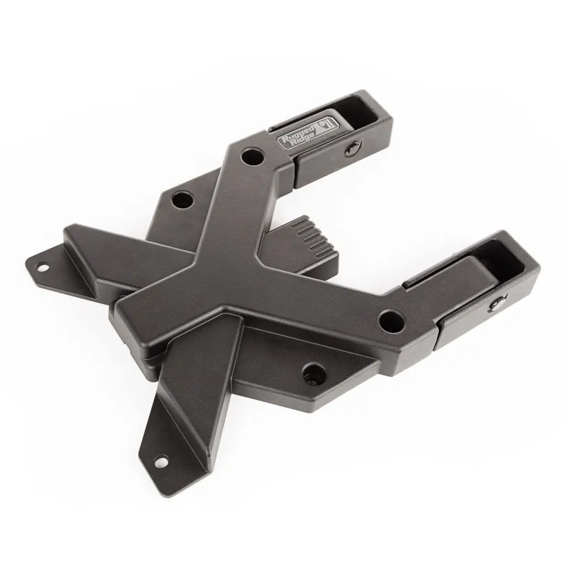 The Spartacus HD Tire Carrier Hinge Casting for 97-06 Jeep Wrangler TJ, Rubicon and Unlimited delivers the perfect balance of strength/stability, allowing you to carry up to a 35 tire/wheel combo without all the extra weight of steel bumper-mounted tire carriers. The Spartacus HD Tire Carrier incorporates a brutally strong die-cast aluminum hinge casting, forged steel hinges and hardened steel pins that replaces the feeble stock tailgate hinges for greater load-bearing capacity while still allowing smooth, one-handed access to the cargo area. Designed to complement the factory spare tire mount OR in combination with the Rugged Ridge HD Wheel Mount (11546.62) for maximum performance, the HD Tire Carrier Hinge Casting will give your tailgate the strength it needs to haul the heavy loads with ease. The hinge casting is protected with a durable black textured powder coat to fend off the elements in even the harshest off-road conditions. Compatible with OE and most aftermarket rear bumpers, the HD Tire Carriers patent-pending design makes it the most functional tire carrier on the market today. No drilling required. Patent Pending
