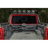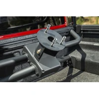 The Rugged Ridge Bed Mount Spare Tire Carrier answers that nagging question on the lips of proud Gladiator owners everywhere, what to do with that over-sized spare? While the factory spare is discretely tucked away under the bed, outfitting your rig with 35 inch or larger tires will have you discovering the Gladiators departure angles to be comparable to an overloaded school bus. Bigger tires do get you over the big rocks, but your low-dangling spare will put an end to your fun in no time at all. Not to mention that lying flat on your back in the muck to access the spare for trail-side tire repair will have you questioning your position on the evolutionary chart. That is why mounting your oversize spare, conveniently and securely, in the truck bed can be a tremendous advantage for off-roaders and overlanders alike. You will find this pre-runner-style Tire Carrier is not just striking in appearance, but engineered to deliver the goods with a hefty load capacity, handily hauling up to a 40-inch wheel and tire combo. Built from muscular 45mm diameter, 2.5mm-wall steel tubing and 5mm thick CNC cut and brake-formed steel plate, this carrier is rock-solid and designed to survive in harsh off-road conditions. The integrated wheel mount is adjustable to accommodate a variety of wheel offsets, while the carrier assembly installs to factory mounting locations for maximum strength and rigidity, with no drilling required. We finished it off with a sleek satin black powder coat to protect from the elements and a limited 5-Year Warranty to protect from everything else, making the Rugged Ridge Bed Mount Tire Carrier a sensible choice for Gladiator owners.